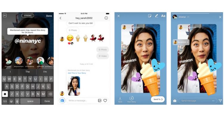 หลังจากเพื่อนๆ ได้โพสต์รูปภาพหรือวิดีโอลงใน Story ของตัวเอง และมีการ Mention ถึงคุณ คุณจะได้รับการแจ้งเตือนผ่านทางข้อความ Direct Message พร้อมกับตัวเลือกในการเพิ่มคอนเท้นต์ลงใน Story รวมถึงการตกแต่งภาพเพิ่มเติมด้วยสติกเกอร์