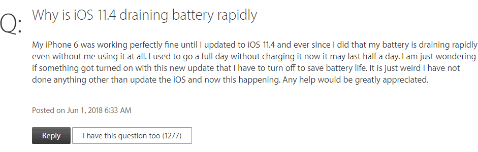 เจ้าของ iPhone 6 ได้รายงานไปยังฟอรั่มของ Apple เพื่อแจ้งว่า iOS 11.4 ทำให้แบตเตอรี่ของ iPhone หมดเร็วกว่าปกติ ซึ่งดูเหมือนจะไม่ได้มีแค่เข้าหรือเธอคนเดียวที่พบปัญหานี้ เพราะมีผู้ใช้งานนับพันรายที่ยืนยันว่าพบปัญหาเดียวกัน