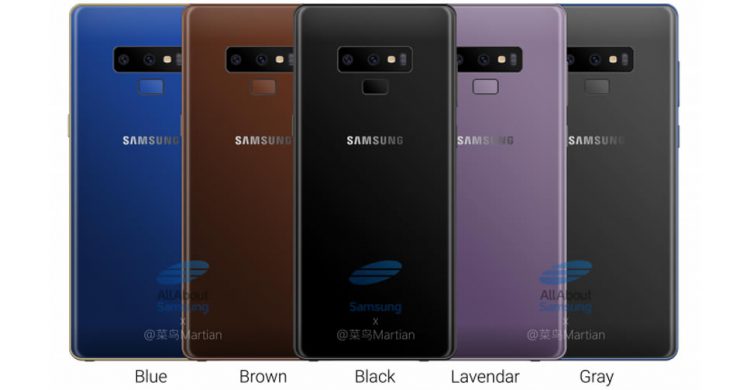ภาพหลุดล่าสุดที่เป็นภาพเรนเดอร์จากโปรแกรมคอมพิวเตอร์ เปิดเผยว่า Samsung Galaxy Note 9 จะมีให้เลือกอย่างน้อย 5 สี ได้แก่ สีดำ, สีเทา, สีม่วง, สีน้ำเงิน และ สีน้ำตาล ซึ่ง Samsung เคยนำสีน้ำตาลมาใช้แล้วกับ Galaxy Note 2