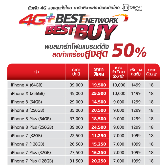 มาอีกแล้วโปรโมชั่นลดราคา iPhone ล่าสุดจาก Truemove H ที่มอบส่วนลดสูงสุดถึง 50% เลยทีเดียวกับ iPhone 7,iPhone 7 Plus ,iPhone 8 ,iPhone 8 Plus และ iPhone X เริ่มต้นเพียง 11,250 บาทเท่านั้น เมื่อสมัครแพ็คเกจ 1099 ,1299 และ 1499 ติดสัญญา 18 เดือนพร้อมชำระค่าบริการล่วงหน้า 7,000 บาท ,9,000 บาทหรือ 10,000 บาท ตามเงื่อนไขกำหนด สามารถผ่อน 0% ได้ทั้งค่าเครื่องและค่าบริการล่วงหน้า ตั้งแต่วันนี้ถึง 31 กรกฎาคม 2561 ที่ทรูช้อปทุกสาขา โดยมีรายละเอียดตามตารางดังต่อไปนี้