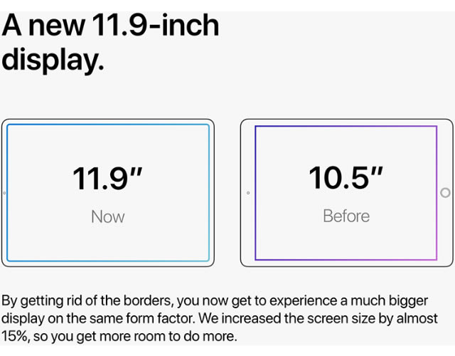 คอนเซ็ปต์ iPad Pro รุ่น 11.9 นิ้ว ที่ออกแบบโดย Álvaro Pabesio มากับขนาดบอดี้เท่ากับรุ่น 10.5 นิ้ว แต่เนื่องจากมีการลดพื้นที่ขอบจอแสดงผลให้แคบลง จึงทำให้มีพื้นที่หน้าจอใหญ่ขึ้น 15%