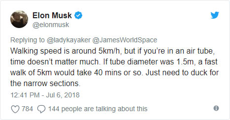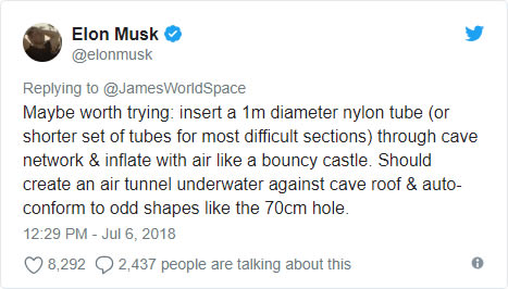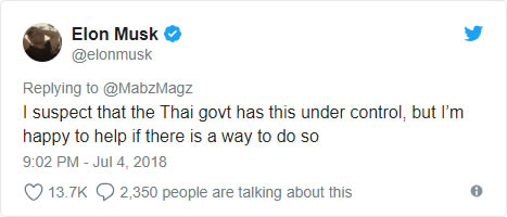 หลังจากทราบข่าวเด็กไทยและโค้ชรวม 13 คน ติดอยู่ในถ้ำหลวง Elon Musk ได้เสนอตัวเป็นครั้งแรก โดยประกาศผ่านบัญชี Twiter @elonmusk เมื่อวันที่ 4 กรกฎาคมที่ผ่านมา “ผมเชื่อว่ารัฐบาลไทยสามารถควบคุมสถานการณ์ได้ดี แต่ผมยินดีที่จะช่วยเหลือหากมีหนทางที่จะทำได้”
