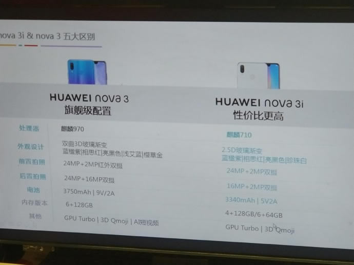 หลังจาก Huawei เปิดรับจอง Nova 3 ไปแล้วเรียบร้อย ก็พบว่ามีแผนเปิดตัว Nova 3i ตามออกมาในอีกไม่นานนี้ โดยมีรายละเอียดทางเทคนิคที่แตกต่างกันพอสมควร แต่ดูเหมือนจะใช้ดีไซน์เดียวกัน จากรูปภาพเปรียบเทียบสเปกที่รั่วไหลออกมา ระบุว่า Nova 3i จะมากับชิป Kirin 710 ส่วน Nova 3 ได้รับชิป Kirin 970 ด้านวัสดุที่ใช้ Nova 3i จะปิดทับด้วยกระจก 2.5D ส่วน Nova 3 ใช้กระจก 3D