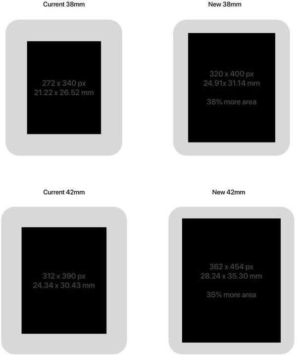 ทางด้านนักพัฒนาซอฟต์แวร์ Ryan Jones ได้คำนวณว่า Apple Watch Series 4 จะมีพื้นที่กว้างขึ้น 35% และ 38% ตามลำดับ เมื่อเทียบกับขนาดจอแสดงผลของ Apple Watch ในปัจจุบัน โดยจอแสดงผลที่ใหญ่ขึ้น ช่วยให้ผู้ใช้งานแตะปุ่มเสมือนจริงบนหน้าจอได้ถนัดขึ้น ให้มุมมองในการแสดงข้อความที่กว้างขึ้น สอดคล้องกับ watchOS 5 ที่สัญญาว่าจะนำคอนเท้นต์ HTML มาสู่ Apple Watch ซึ่งจอแสดงผลที่ใหญ่ขึ้น ช่วยเพิ่มประสบการณ์การเยี่ยมชมเว็บไซต์บน Apple Watch ได้ดีขึ้น