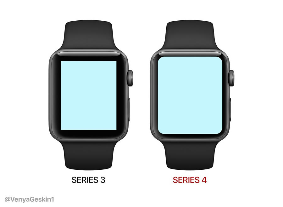 อย่างไรก็ตาม Benjamin Geskin ดีไซเนอร์เจ้าของบัญชี Twitter @VenyaGeskin1 เชื่อว่า Apple Watch Series 4 จะมีขนาดบอดี้เท่าเดิม พร้อมกับสร้างคอนเซ็ปต์ออกมาให้เห็นภาพอย่างชัดเจน ด้วยการเปรียบเทียบกับรุ่นเก่า โดยออกแบบให้ Apple Watch Series 4 มีขอบจอที่บางลง และมุมทั้ง 4 ของจอภาพก็โค้งมน