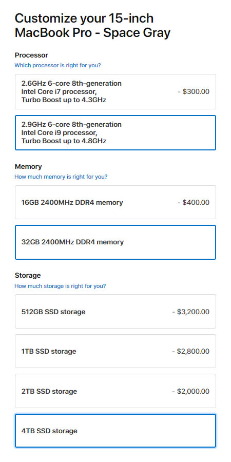 แต่ Apple เปิดโอกาสให้ลูกค้าได้อัพเกรดฮาร์ดแวร์เพิ่มเติม โดยมีโปรเซสเซอร์ Intel Core i9 รุ่นที่ 8 แบบ 6-core ความเร็ว 2.9GHz เป็นตัวเลือก พร้อมขยาย RAM เป็น 32GB และความจุ SSD 4TB ซึ่งทั้งหมดนี้ต้องจ่ายในราคา 6,699 ดอลล่าร์สหรัฐ หรือราว 222,800 บาท (ราคาจริงเมื่อวางจำหน่ายในประเทศไทยอาจบวกเพิ่มจากนี้อีก)