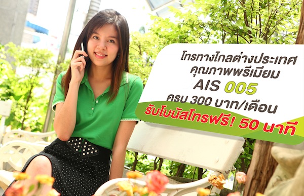 วันนี้ลูกค้าเอไอเอสที่ใช้บริการโทรทางไกลต่างประเทศคุณภาพพรีเมียม ผ่านรหัส 005 รับโบนัสโทรฟรีในประเทศ 50 นาที ใช้งานได้นาน 30 วัน ได้แบบง่ายๆ โดยไม่ต้องลุ้น เพียงสะสมยอดใช้บริการโทรทางไกลต่างประเทศ ครบ 300 บาท ต่อเดือน สมัครฟรี! เพียง กด *258# แล้วโทรออก ตั้งแต่วันนี้ – 31 ก.ค. 55 สอบถามรายละเอียดเพิ่มเติมได้ที่ AIS Call Center 1175 หรือ 02-2719-005 และดูรายละเอียดเพิ่มเติมได้ที่ www.ain.co.th