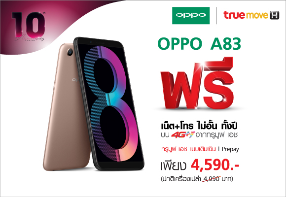 เริ่มที่โปรโมชั่นสุดพิเศษเหนือใครเพื่อแทนคำขอบคุณ มอบ OPPO A83 16GB เครื่องสีทองสุดหรูให้ไปใช้กับแบบฟรีๆ ทันทีเมื่อซื้อแพ็คเกจซิมเติมเงิน 4G TrueMove H เล่นเน็ต+โทรไม่อั้นในตลอด 1 ปีเต็ม ในราคาเพียง 4,590 บาท โดยโปรนี้จะสิ้นสุดวันที่ 31 ก.ค. 61 นี้เท่านั้น!! สามารสามารถสอบถามรายละเอียดได้ที่ OPPO Brand Shop และตัวแทนจำหน่ายทั่วประเทศ