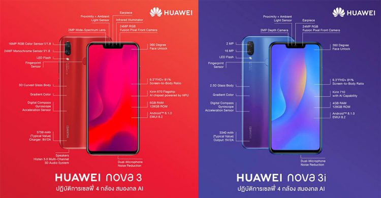 Huawei Nova 3 กับ Nova 3i มากับจอแสดงผล IPS LCD (2340 x 1080 พิกเซล) ขนาด 6.3 นิ้ว ทำงานบนระบบปฏิบัติการ Android 8.1 Oreo สวมทับด้วย EMUI 8.2 กล้องคู่เซลฟี่ 24 + 2 ล้านพิกเซล รูรับแสง F/2.0 รองรับฟีเจอร์ 3D Qmoji เปลี่ยนใบหน้าของผู้ใช้งานให้กลายเป็นตัวการ์ตูนน่ารัก กล้องคู่เซลฟี่ของ Nova 3i ยังได้รับเทคโนโลยี AI เช่นเดียวกัน รวมถึงโหมด HDR Pro ที่ช่วยให้ถ่ายภาพเซลฟี่หรือถ่ายวีดีโอ ได้อย่างสวยงามแม้อยู่ในบริเวณที่มีแสงแดดจ้า นอกจากนี้ระบบการเชื่อมต่อไร้สาย และเซ็นเซอร์ต่างๆ ก็มีมาให้เหมือนกัน