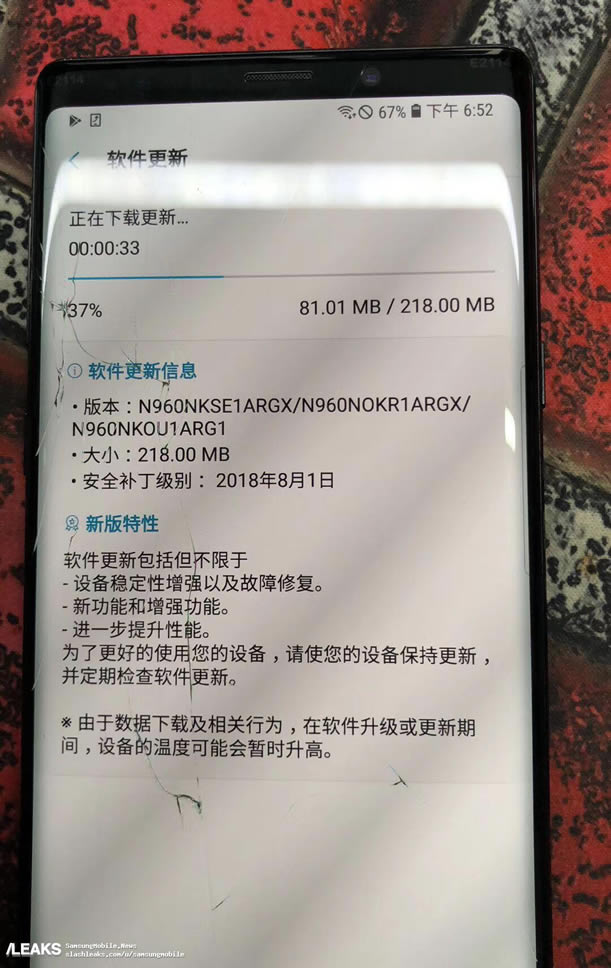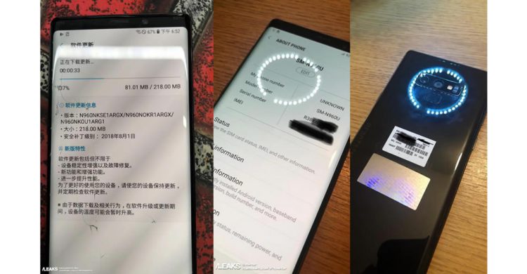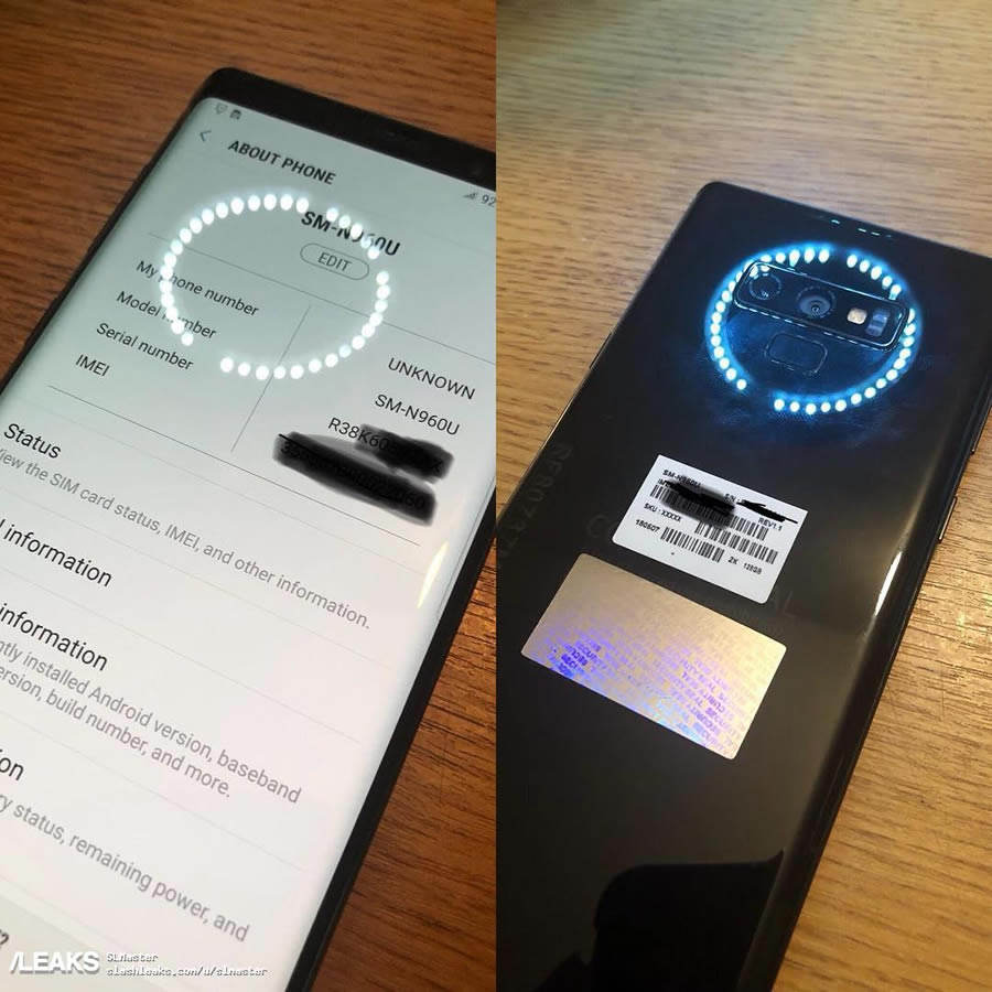 ภาพแรกแสดงให้เห็นหน้าจอ About Phone ซึ่งแสดงรหัสรุ่น SM-N960U สอดคล้องกับ Galaxy Note 8 ที่ใช้รหัสรุ่น SM-N950 อีกภาพที่ถูกนำมาประกบคู่กันแสดงให้เห็นระบบกล้องคู่หลังแนวนอนเหมือนกับรุ่นก่อน แต่ย้ายเซ็นเซอร์สแกนลายนิ้วมือลงมาไว้ใต้เลนส์กล้อง เหมือนกับภาพเรนเดอร์ที่รั่วไหลออกมาก่อนหน้านี้ และสังเกตว่าระบบกล้องคู่นั้นจะมีกลไกปรับขนาดรูรับแสงอัตโนมัติแบบเดียวกับที่พบใน Galaxy S9 series