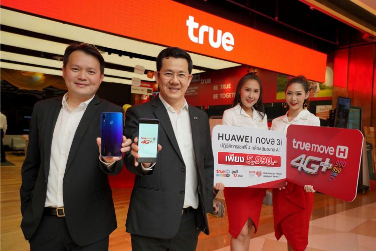 ทรูมูฟ เอช เครือข่าย 4G ยอดเยี่ยมแห่งปีในเอเชียแปซิฟิก และเครือข่ายอันดับ 1 ของคนไทย โดย นายทวนทอง ศรีวิเชียร (ที่ 2 จากซ้าย) ผู้อำนวยการ ด้านบริหารผลิตภัณฑ์ดีไวซ์ บริษัท ทรู คอร์ปอเรชั่น จำกัด (มหาชน) ร่วมกับ หัวเว่ย โดย นายทศพร นิษฐานนท์ (ซ้ายสุด) รองผู้อำนวยการ หัวเว่ย คอนซูมเมอร์ บิสสิเนส กรุ๊ป (ประเทศไทย) เปิดให้คนไทยจองเป็นเจ้าของ HUAWEI nova 3i สัมผัสประสบการณ์การถ่ายภาพระดับมืออาชีพบนเครือข่าย 4G ที่ดีที่สุดจาก ทรูมูฟ เอช ปฏิวัติการเซลฟี่ด้วย 4 กล้องสมองกล AI พร้อมมอบข้อเสนอสุดพิเศษ สำหรับลูกค้าทรูมูฟ เอช เพียง 5,990 บาท ปกติ 9,990 บาท