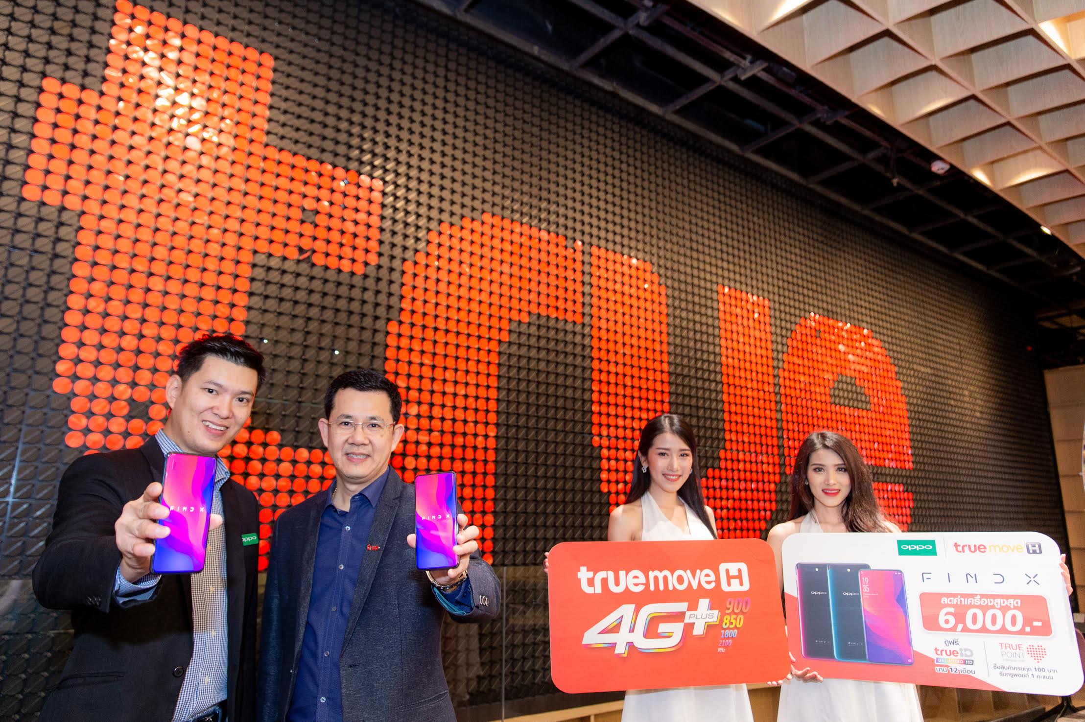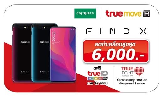 และทรูมูฟ เอช เครือข่าย 4G ยอดเยี่ยมแห่งปีในเอเชียแปซิฟิก และเครือข่ายอันดับ 1 ของคนไทย มอบข้อเสนอสุดพิเศษสำหรับลูกค้าทรูมูฟ เอช รับส่วนลดค่าเครื่องสูงสุด 6,000 บาท ปกติ 29,990 บาท เหลือเพียง 23,990 บาท เมื่อสมัครแพ็กเกจ 4G+ FUN Unlimited 1099 ขึ้นไปและชำระค่าบริการล่วงหน้า 3,000 บาท หรือรับส่วนลดค่าเครื่อง 4,000 บาท เมื่อสมัครแพ็กเกจ 4G+ FUN Unlimited 899 พร้อมชำระค่าบริการล่วงหน้า 1,500 บาท (ระยะสัญญา 12 เดือน) ดูฟรี TrueID Unlimited HD ชมฟุตบอลพรีเมียร์ลีกฤดูกาลใหม่ ครบ 380 แมตช์ โดยไม่เสียค่าเน็ต และรับคะแนนสะสมทรูพอยท์ (ซื้อสินค้าครบทุก 100 บาท รับทรูพอยท์ 1 คะแนน) สำหรับลูกค้าทรูมูฟ เอช ที่จอง OPPO FIND X รับของที่ระลึกสุดพิเศษจาก OPPO หูฟัง Marshall Headphone มูลค่า 5,130 บาทและ VIP Card รับประกันจอแตก นาน 12 เดือน มูลค่า 19,999 บาท เปิดให้จองเป็นเจ้าของกันตั้งแต่วันที่ 28 กรกฎาคม – 4 สิงหาคม 2561 และจำหน่ายอย่างเป็นทางการวันที่ 5 สิงหาคม 2561 ที่ทรูช้อปที่ร่วมรายการ