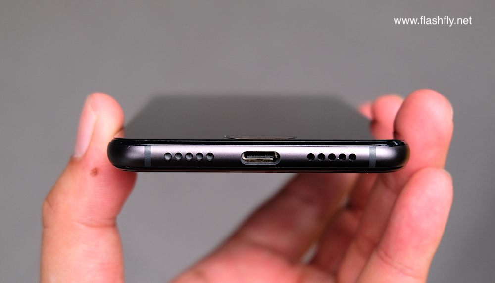 ส่วนด้านล่างมีตะแกรงลำโพงคู่ ตรงกลางเป็นพอร์ต USB Type-C และ ไม่มีช่องเสียบแจ็คหูฟัง 3.5 มม. ซึ่งไม่พบในรุ่น P20 Pro เช่นเดียวกัน แต่ในกล่องจะแถมหูฟังที่ใช้พอร์ต USB-C มาให้อยู่แล้ว และยังแถม Adapter มาให้ด้วย สำหรับแปลงพอร์ต USB-C เป็นแจ็ค 3.5 มม. เผื่อใครยังยึดติดกับชุดหูฟังของเดิม