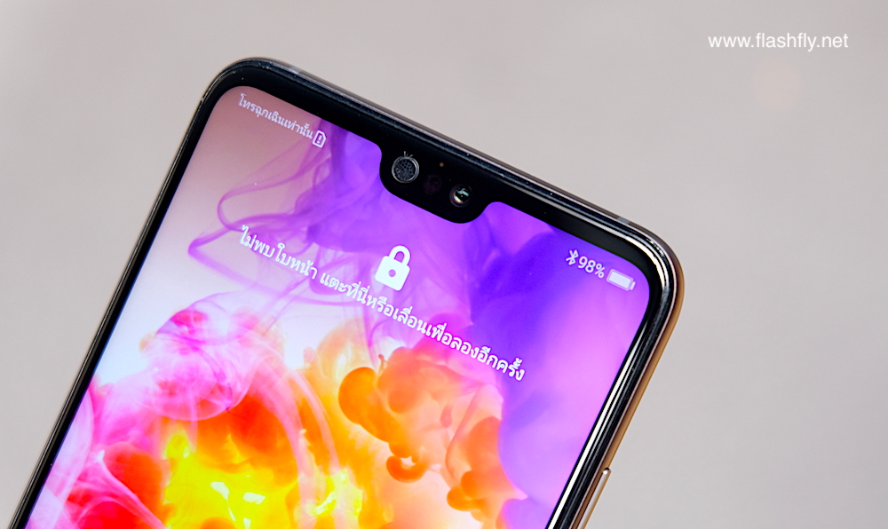 โดยมีรอยบากที่ขอบจอบน ภายในรอยบากประกอบไปด้วยกล้องเซลฟี่, เซ็นเซอร์ และลำโพงหูฟัง (HUAWEI ติดฟิล์มกันรอยมาให้แล้วจากโรงงาน พร้อมแถมเคสแบบ TPU ไม่ต้องไปหาซื้อเพิ่มแต่อย่างใด)
