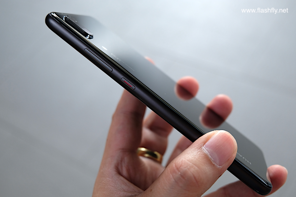 อีกข้างหนึ่งติดตั้งปุ่มปรับระดับเสียง กับปุ่มเพาเวอร์ ส่วนความบางนั้นอยู่ที่ 7.65 มิลลิเมตร บางกว่า P20 Pro เล็กน้อย (7.8 มิลลิเมตร) แต่ P20 Pro ให้แบตเตอรี่มาเยอะกว่า (4000 mAh) และทำให้ P20 มีน้ำหนักเบากว่าด้วย อยู่ที่ 165 กรัม ส่วนรุ่นพี่ 180 กรัม