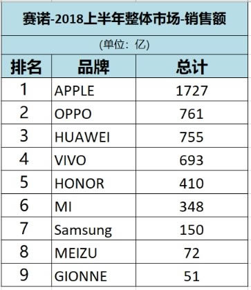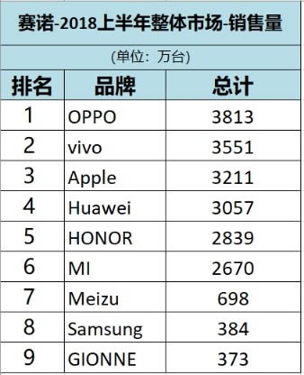 บริษัทวิจัยตลาด Sino รายงานยอดขายสมาร์ทโฟนในประเทศจีน หลังจากผ่าน 6 เดือนแรกของปี 2018 โดยแบ่งการรายงานออกเป็น 2 ส่วน ส่วนแรกจัดอันดับแบรนด์สมาร์ทโฟนตามจำนวนที่ขายได้ ส่วนที่สองจัดอันดับแบรนด์สมาร์ทโฟนตามรายได้