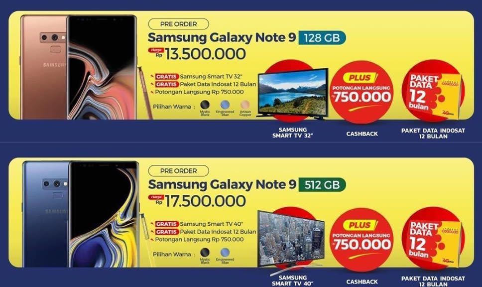 ร้านค้าแห่งหนึ่งในประเทศอินโดนีเซีย ได้เปิดเผยราคาของ Samsung Galaxy Note 9 ออกมาแล้ว โดยรุ่น 128GB จะมีราคา 13,500,000 รูเปียห์ หรือราว 31,100 บาท พร้อมรับ Smart TV ขนาด 32 นิ้ว เป็นของแถม ส่วนรุ่น 512GB ราคา 17,500,000 รูเปียห์ หรือราว 40,300 บาท พร้อมรับ Smart TV ขนาด 40 นิ้ว เป็นของแถม ทั้ง 2 รุ่น ยังได้รับเครดิตเงินคืนและแพ็คเกจดาต้านาน 12 เดือน
