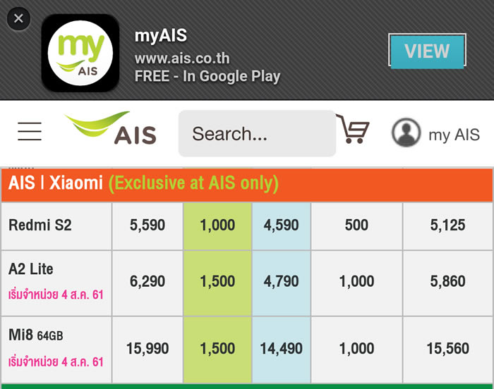 Xiaomi Mi 8 รุ่น 64GB จะมีราคาเครื่องเปล่าอยู่ที่ 15,990 บาท ส่วน Xiaomi Mi A2 Lite จะวางจำหน่ายในราคา 6,290 บาท