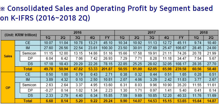 Samsung รายงานผลประกอบการของบริษัทฯ ประจำไตรมาสที่ 2 ปี 2018 มีรายได้โดยรวมอยู่ที่ 58.48 ล้านล้านวอน หรือราว 1.72 ล้านล้านบาท ซึ่งต่ำสุดในรอบ 12 เดือนที่ผ่านมา เป็นผลมาจากความต้องการที่ลดลงในกลุ่มผลิตภัณฑ์สมาร์ทโฟน และแผงจอแสดงผล ขณะที่ผลิตภัณฑ์ในกลุ่มชิปความจำยังคงแข็งแกร่ง