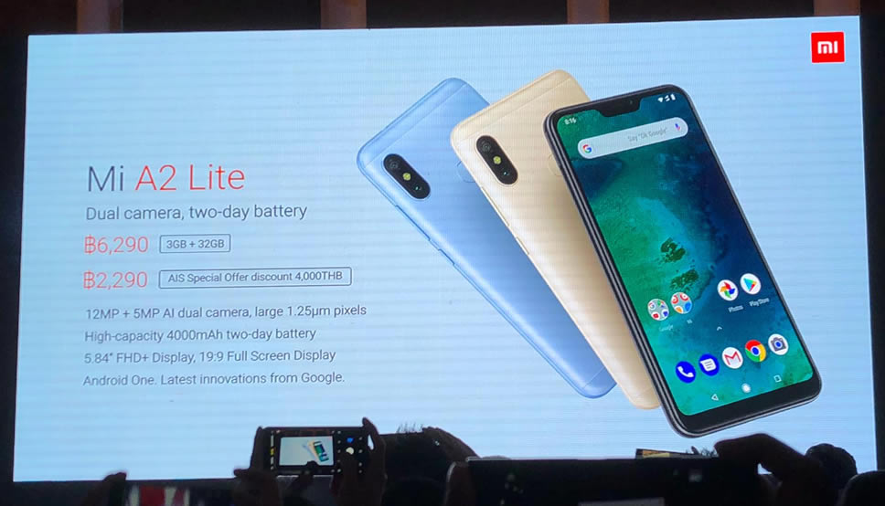 Xiaomi Mi A2 Lite มาพร้อม RAM 3GB จับคู่กับ ROM 32GB ราคาเครื่องเปล่า 6,290 บาท หรือซื้อพร้อมสมัครแพ็กเกจจาก AIS จะได้รับส่วนลดถึง 4,000 บาท