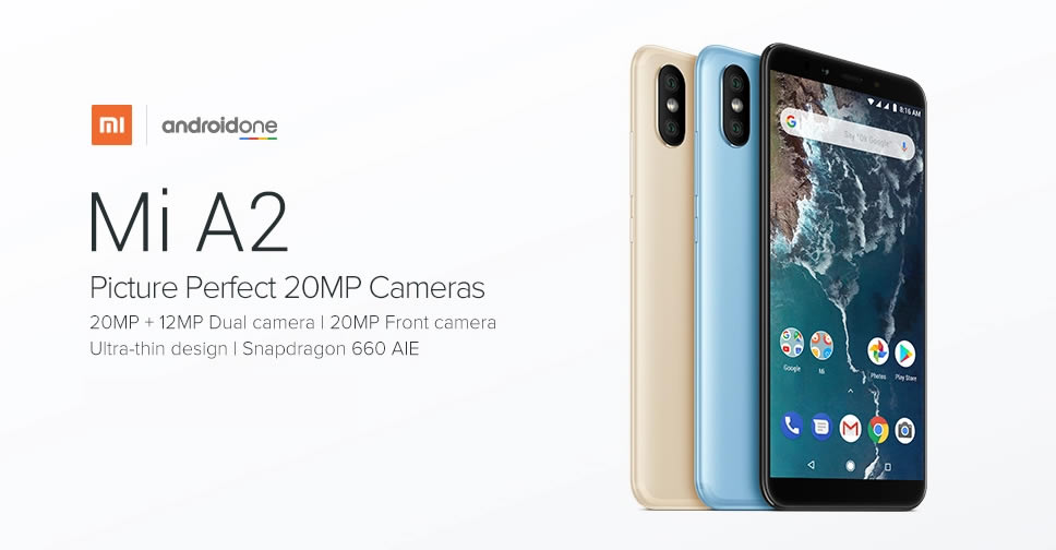 Xiaomi Mi A2 ใช้จอแสดงผล ขนาด 5.99 นิ้ว ดีไซน์ Full Screen Display ไร้รอยบาก ประมวลผลด้วยชิป Qualcomm Snapdragon 660 AIE กล้องคู่หลัง 12 + 20 ล้านพิกเซล รูรับแสง F1.75 ทั้ง 2 เลนส์ รองรับโหมด AI Portrait กล้องเซลฟี่ 20 ล้านพิกเซล พร้อมเทคโนโลยี AI ช่วยในการถ่ายภาพในโหมด Beauty และมีเทคโนโลยี 4-in-1 Super Pixel ช่วยถ่ายภาพในที่แสงน้อยให้ออกมาสมบูรณ์แบบ รองรับการเชื่อมต่อ Bluetooth 5.0, USB Type-C ความจุแบตเตอรี่ 3,000mAh