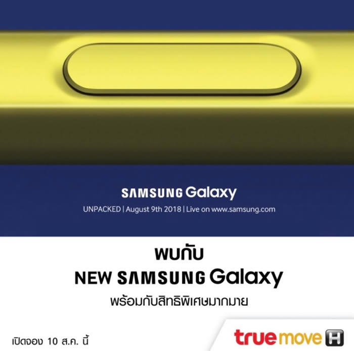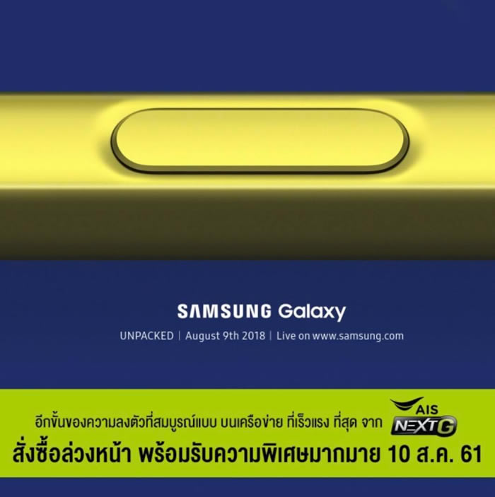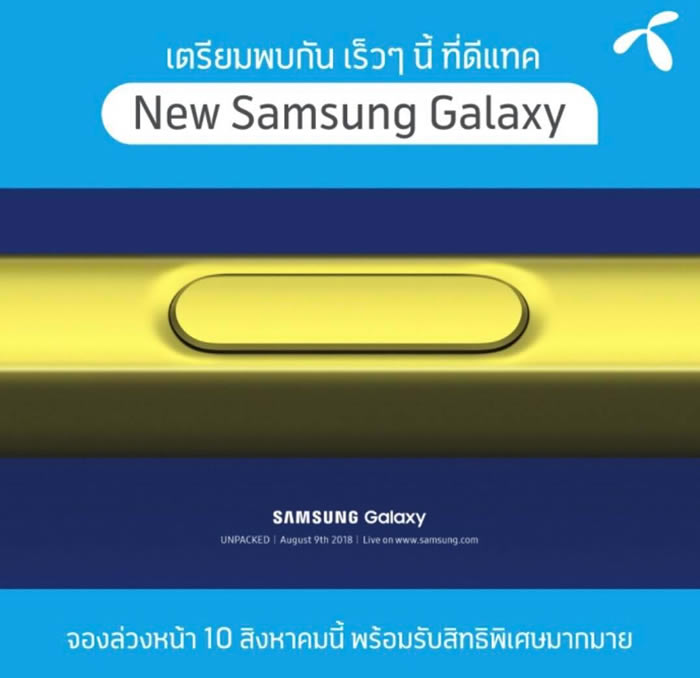 Samsung เตรียมเปิดตัวสมาร์ทโฟนระดับพรีเมี่ยมรุ่นใหม่ Galaxy Note 9 ในวันที่ 9 สิงหาคมนี้ และประเทศไทยจะได้อยู่ในกลุ่มแรกที่ Samsung ให้ความสำคัญในการทำตลาด โดยจะเปิดให้จับจองทันทีในวันถัดไป คือ วันที่ 10 สิงหาคมนี้ ผ่านผู้ให้บริการเครือข่ายโทรศัพท์เคลื่อนที่ทั้ง 3 ราย คือ เอไอเอส, ดีแทค และ ทรูมูฟ เอช