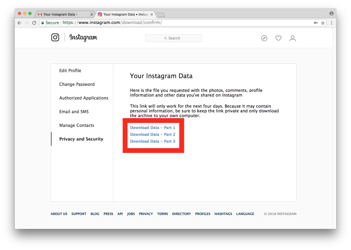 5. เข้าสู่ระบบ Instagram อีกครั้ง จาก Link ที่กดเข้ามาทาง Email แล้วคลิกที่ Download Data สำหรับข้อมูลที่จะดาวน์โหลดอาจถูกแบ่งออกเป็นหลายไฟล์ ตามชื่อ Download Data – Part 1, Part 2, Part 3, Part 4 เป็นต้น ซึ่งต้องกดดาวน์โหลดทุก Link ที่ถูกแยกมา ซึ่งไฟล์ทั้งหมดอาจต้องการพื้นที่ว่างจำนวนมากในฮาร์ดดิสก์