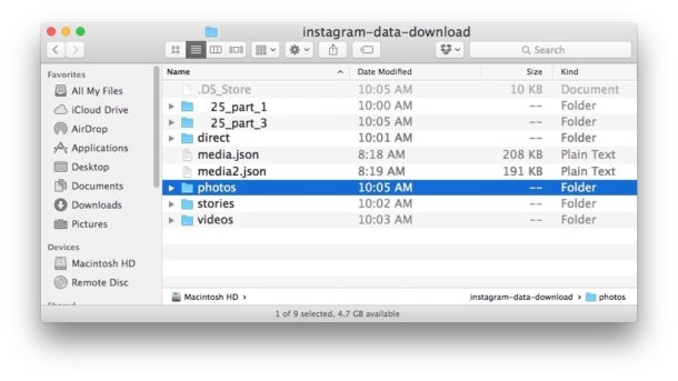 หลังจากดาวน์โหลดเสร็จสิ้น ผู้ใช้งานจะได้รับข้อมูลทุกอย่างที่อยู่ในบัญชี Instagram ของตัวเอง โดยข้อมูลจะถูกแยกออกเป็นโฟลเดอร์ให้เรียบร้อย ด้วยชื่อเรียกที่แตกต่างกันตามประเภทของไฟล์ เช่น photos, stories, videos, direct เป็นต้น และทั้งหมดนี้คือวิธีการดาวน์โหลดรูปภาพและวีดีโอทั้งหมดจากบัญชี Instagram ส่วนตัว โดยไม่ต้องอาศัยเครื่องมือหรือโปรแกรมจากบุคคลที่สาม