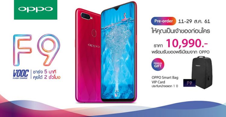 OPPO ประกาศราคาสมาร์ทโฟนรุ่นใหม่ล่าสุด OPPO F9 โดยจะเปิดให้ผู้ที่สนใจจับจองเป็นเจ้าของในระหว่างวันที่ 11 – 29 สิงหาคมนี้ ราคา 10,990 บาท พร้อมรับของแถมสุดพิเศษ 3 รายการ ได้แก่ รับประกันจอแสดงผลแตกภายใน 1 ปี, กระเป๋า OPPO Smart Bag และบัตร VIP Card