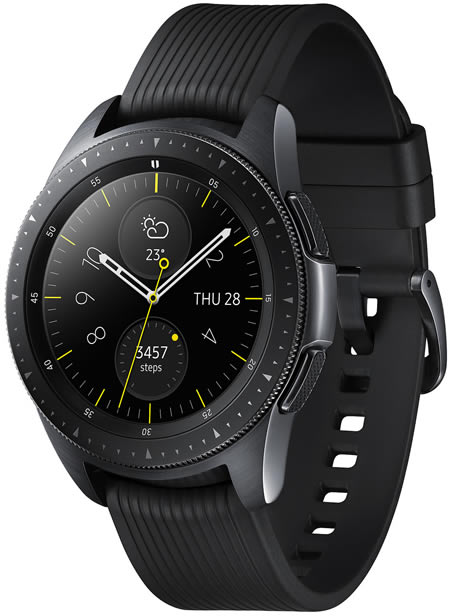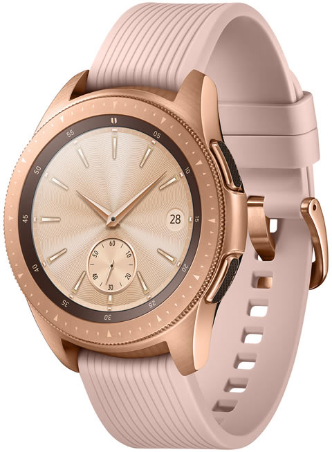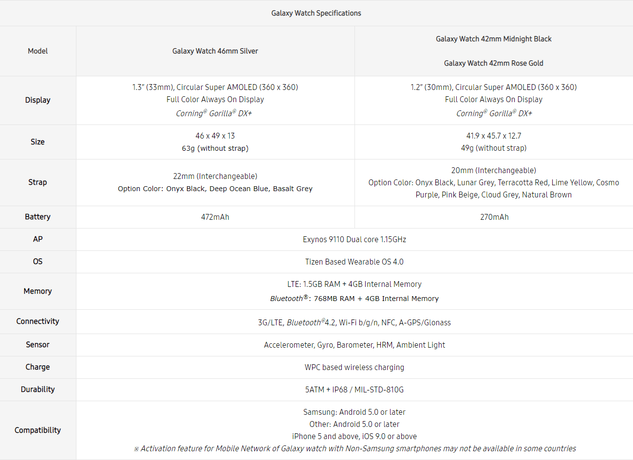 Samsung Galaxy Watch ขนาด 42 มิลลิเมตร มีให้เลือก 2 สี คือ Midnight Black กับ Rose Gold มากับจอแสดงผล Circular Super AMOLED (360 x 360 พิกเซล) ขนาด 1.2 นิ้ว แบตเตอรี่ 270mAh ราคา 329.99 ดอลล่าร์สหรัฐ หรือราว 10,965 บาท