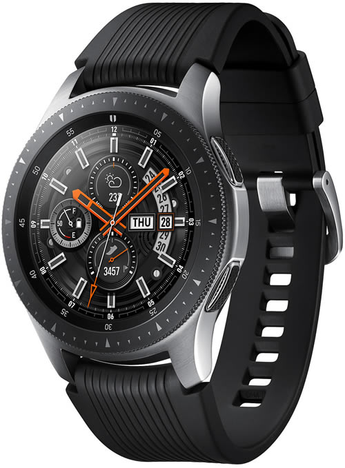 Samsung Galaxy Watch ขนาด 46 มิลลิเมตร มีให้เลือกเฉพาะสี Silver มากับจอแสดงผล Circular Super AMOLED (360 x 360 พิกเซล) ขนาด 1.3 นิ้ว แบตเตอรี่ 472mAh ราคา 349.99 ดอลล่าร์สหรัฐ หรือราว 11,625 บาท