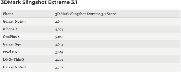 มาถึงการทดสอบด้านกราฟิกด้วย 3DMark Slingshot Extreme 3.1 เป็น OnePlus 6 ที่ทำคะแนนได้มากที่สุด 5,124 คะแนน ตามมาด้วย iPhone X ทำได้ 4,994 คะแนน และ Galaxy Note 9 ได้รับ 4,639 คะแนน ใกล้เคียงกับ Galaxy S9+ ที่ทำได้ 4,634 คะแนน