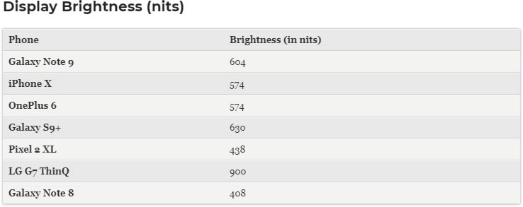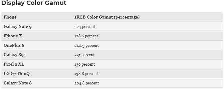 สำหรับการทดสอบจอแสดงผล Samsung Galaxy Note 9 ทำได้ดีกว่า iPhone X ทั้งค่าความสว่าง และค่าสี sRGB Color Gamut ทั้งนี้ คะแนนจากการทดสอบมาจาก Samsung Galaxy Note 9 รุ่น RAM 6GB จับคู่กับ ROM 128GB และใช้ชิปประมวลผล Qualcomm Snapdragon 845