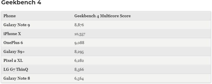 ผลจากการทดสอบด้วย Geekbench 4 (Multicore Score) พบว่า Galaxy Note 9 ได้รับ 8,876 คะแนน ขณะที่ Galaxy Note 8 ทำได้เพียง 6,564 คะแนน อย่างไรก็ตาม OnePlus 6 (RAM 8GB) ทำได้ 9,088 คะแนน และเป็น iPhone X ที่ทำคะแนนสูงสุดสุด 10,357 คะแนน