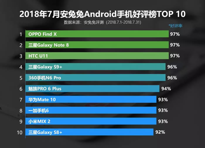 แอพพลิเคชั่น AnTuTu ได้จัดอันดับ TOP 10 สมาร์ทโฟนที่ได้รับคำชมจากผู้ใช้งานมากที่สุด ในระหว่างวันที่ 1 – 31 กรกฎาคม 2018 โดยอันดับ 1 ตกเป็นของ OPPO Find X ได้รับคำแนน 97%