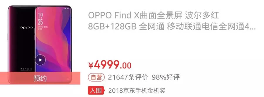 นอกจากนี้ OPPO Find X ยังได้รับคำแนนจากร้านค้าออนไลน์รายใหญ่ Jingdong (JD.com) ถึง 98% ซึ่งสะท้อนถึงความพึงพอใจของผู้ใช้สมาร์ทโฟนรุ่นนี้