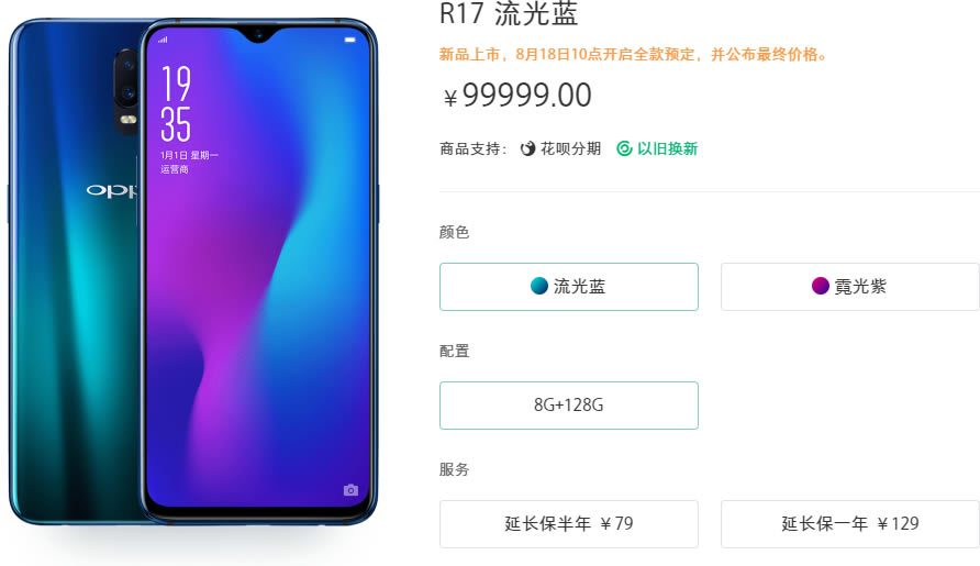 OPPO R17 จะเริ่มวางจำหน่ายในประเทศจีน วันที่ 18 สิงหาคมนี้ ในราคาสุดช็อก 99,999 หยวน หรือเกือบ 500,000 บาท แน่นอนว่าไม่ใช่ราคาที่แท้จริง คาดว่า OPPO จะประกาศราคา R17 ออกมาในวันวางจำหน่าย