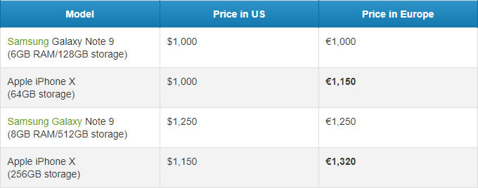 เว็บไซต์ Phonearena ทำตารางเปรียบเทียบให้เห็นราคาของ Galaxy Note 9 กับ iPhone X ในสหรัฐอเมริกาและยุโรป ซึ่งจะพบว่าสมาร์ทโฟนทั้ง 2 รุ่น มีราคาเท่ากันในสหรัฐฯ แต่ในยุโรป iPhone X จะมีราคาสูงกว่า ซึ่งในความเป็นจริง iPhone X ยังเป็นสมาร์ทโฟนที่มีราคาสูงที่สุดในตลาดปัจจุบัน (ไม่รวมรุ่นพิเศษ) ถึงแม้จะวางจำหน่ายมาตั้งแต่ปลายปี 2017