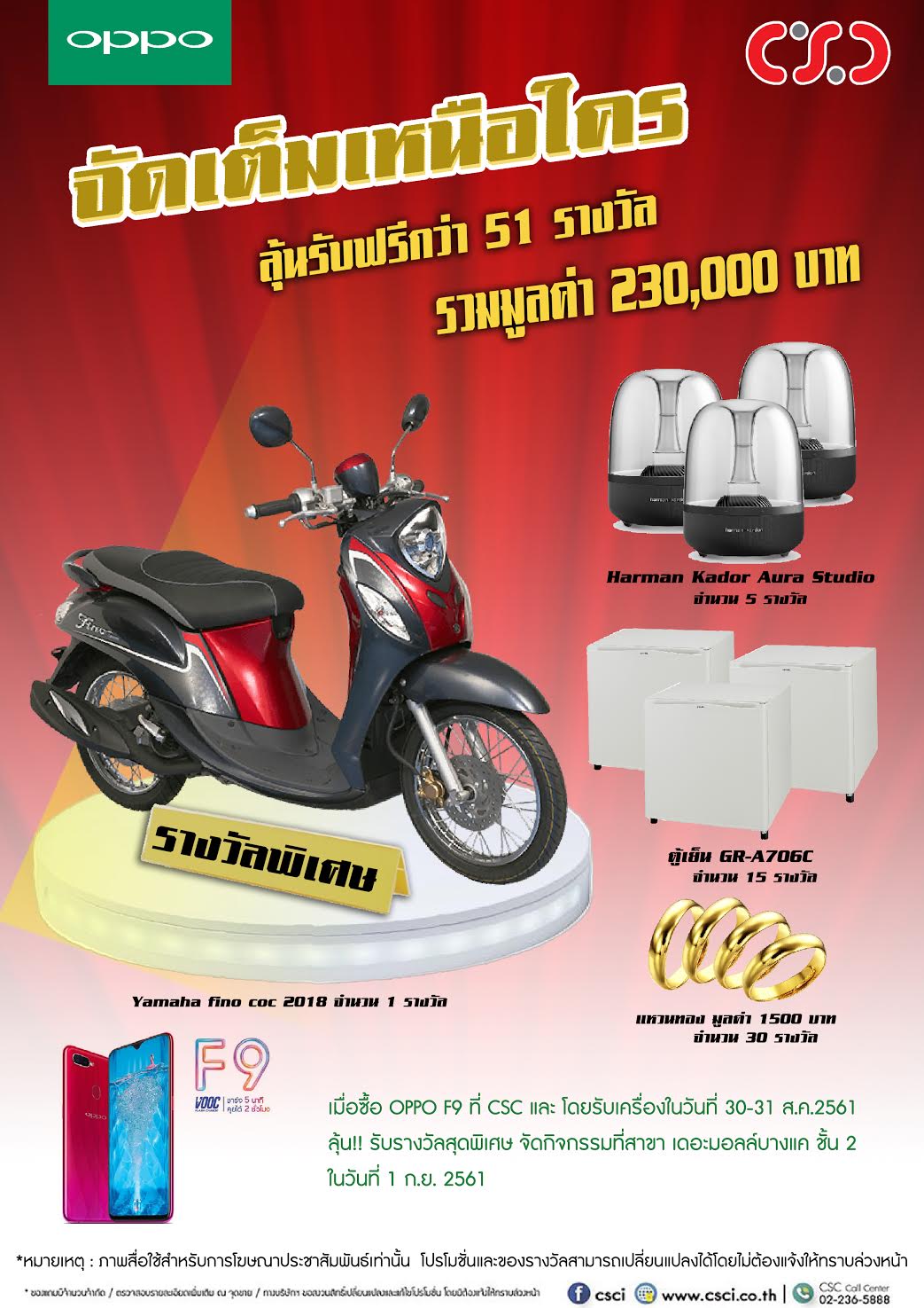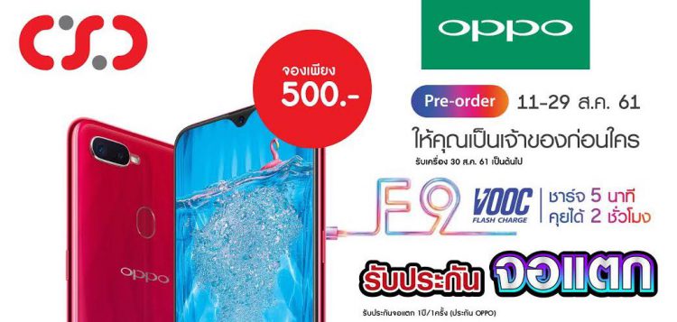 จัดเต็มเหนือใคร กับโปรโมชั่นสุดพิเศษจาก CSC ร่วมกับ OPPO F9 ทั้งรับและลุ้น! สุดอลังการ รวมมูลค่ากว่า 230,000 บาท เมื่อลูกค้าที่จองและรับเครื่อง OPPO F9 ที่ร้าน CSC ทุกสาขา โดยรับเครื่องในวันที่ 30-31 ส.ค.2561 มีสิทธิลุ้น!! รับรางวัลได้ที่ CSC Shop ในวันที่ 1 ก.ย. 2561 สาขา เดอะมอลล์บางแค ชั้น 2 เวลา 10.00 – 12.00 น.