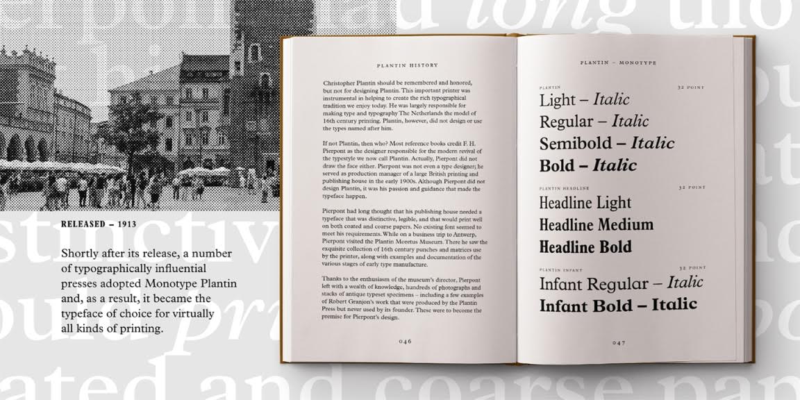 ฟอนต์นี้เพิ่งได้รับการฉลองวาระครบรอบ 100 ปีเมื่อไม่นานมานี้ และยังคงถูกใช้งานอย่างแพร่หลาย ที่จริงแล้ว ฟอนต์นี้คือต้นแบบแรงบันดาลใจสำหรับฟอนต์ Times New Roman โดยถูกตั้งชื่อตาม Christopher Plantin เจ้าของโรงพิมพ์ในศตวรรษที่ 16 แม่พิมพ์ต้นฉบับของฟอนต์อักษรนี้ถูกสร้างขึ้นในปี ค.ศ. 1913 สำหรับการเรียงพิมพ์โดยใช้โลหะร้อน และปัจจุบันเรามีเวอร์ชั่นดิจิทัลที่ดูเป็นระเบียบเรียบร้อยสำหรับฟอนต์อักษรนี้แล้ว