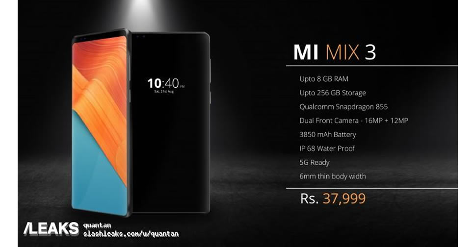 สเปกบนรูปภาพยังระบุว่า Xiaomi Mi MIX 3 จะใช้ชิปประมวลผล Qualcomm Snapdragon 855 ความจำ RAM 8GB จับคู่กับ ROM 256GB กล้องคู่เซลฟี่ 16 + 12 ล้านพิกเซล แบตเตอรี่ 3850mAh และแขวนป้ายราคาในอินเดียที่ 37,999 รูปี หรือราว 18,000 บาท