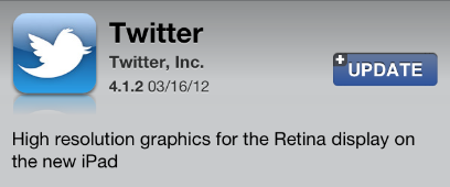 Twitter ออกตัวแรงก่อนใครเลยทีเดียว ตัวแอพเวอร์ชั่นล่าสุดได้ปรับกราฟฟิคเพื่อรองรับหน้าจอ Retina ของ The new iPad โดยเฉพาะ ทำให้ผู้ที่ได้รับเครื่องในวันนี้สามารถใช้งาน Twitter ได้แบบสวยงามไม่มีตัวอักษรเบลอหรือแตกอย่างแน่นอน น่าจะสร้างความเพลิดเพลินให้กับผู้ใช้งานได้ไม่น้อย สามารถอัพเดทผ่านทาง App Store หรือคลิกผ่านลิงค์ทางด้านล่างได้เลย