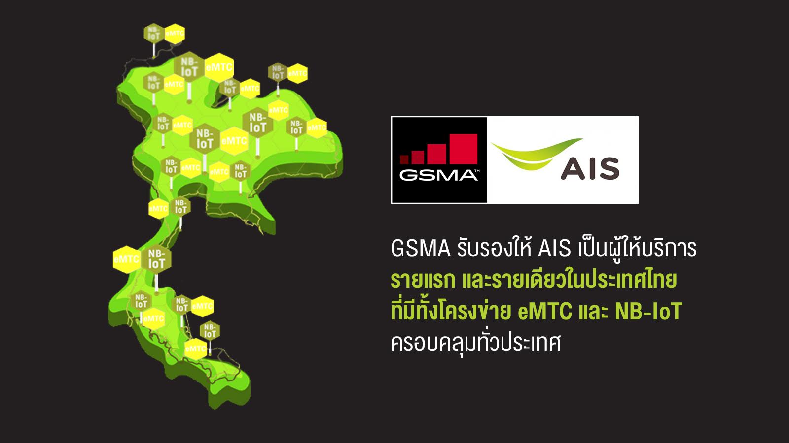 โดยเมื่อวันที่ 17 สิงหาคม 2561 ที่ผ่านมา GSMA สมาคมผู้ให้บริการเครือข่ายโทรคมนาคมที่มีสมาชิกมากกว่า 800 รายทั่วโลก ประกาศรับรองให้ เอไอเอส เป็นผู้ให้บริการ ที่มีทั้งโครงข่าย eMTC และ NB-IoT ครอบคลุมทั่วประเทศ เป็นรายแรกและรายเดียวในไทย