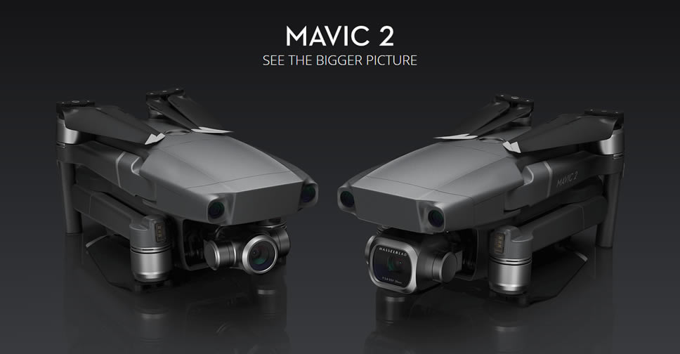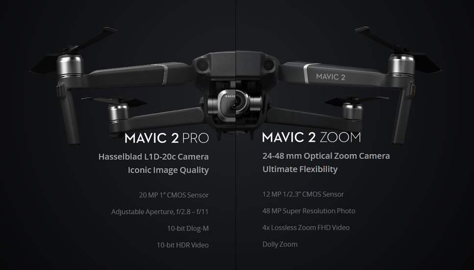 DJI เปิดตัวโดรนรุ่นใหม่ล่าสุด Mavic 2 Pro และ Mavic 2 Zoom ทั้ง 2 รุ่น ใช้โดรนลำเดียวกัน แต่มีความแตกต่างที่โมดูลกล้อง Mavic 2 Zoom มาพร้อมกล้อง 12 ล้านพิกเซล ขนาดเซ็นเซอร์ 1/2.3 นิ้ว ซูมออฟติคอล 2 เท่า สำหรับรุ่น Mavic 2 Pro จะใช้กล้อง Hasselblad L1D-20c ความละเอียด 20 ล้านพิกเซล ขนาดเซ็นเซอร์ 1 นิ้ว ถ่ายวีดีโอ 10-bit HDR