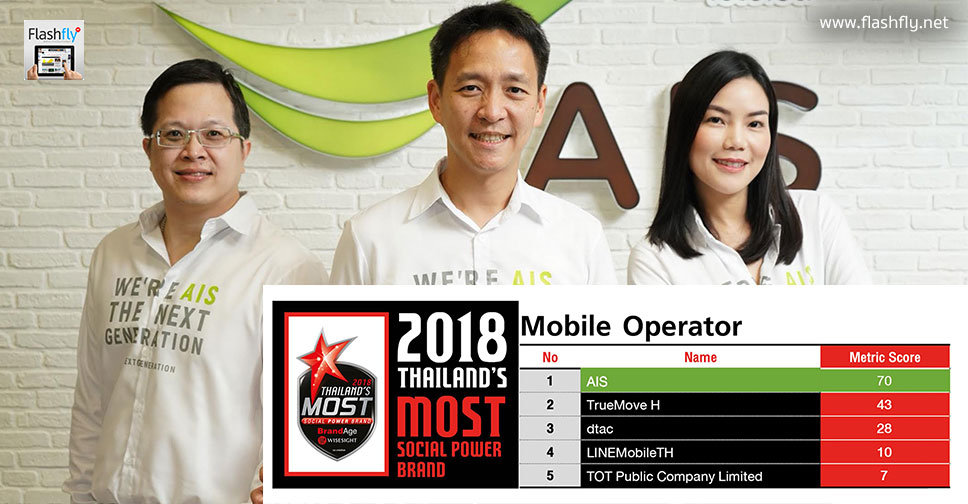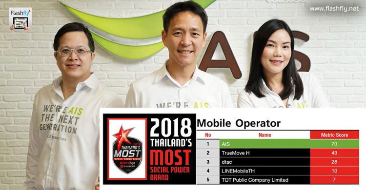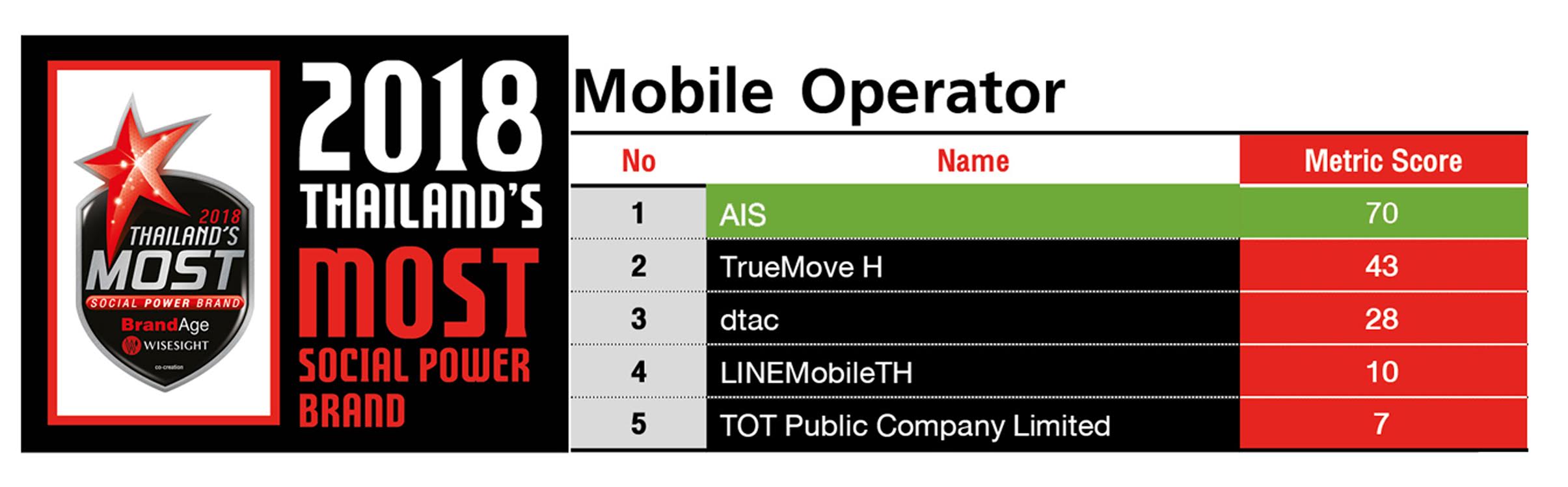 ส่งผลให้ในปีนี้ เอไอเอส ได้รับการคัดเลือกให้เป็น สุดยอดแบรนด์ทรงพลังบนโลกโซเชียลมีเดียอันดับ 1 ในกลุ่มMobile Operator จาก Thailand’s Most Social Power Brand 2018 ที่จัดขึ้นโดยนิตยสาร BrandAge และ ไวซ์ไซท์ ผู้นำการวิเคราะห์ข้อมูลบนโลกโซเชียลเพื่อสำรวจแบรนด์ที่ประสบความสำเร็จสูงสุดบนโลกโซเชียลมีเดีย ซึ่งสามารถสะท้อนถึง Performance ของเอไอเอส ในการใช้โซเชียลมีเดียได้อย่างมีประสิทธิภาพสูงสุด