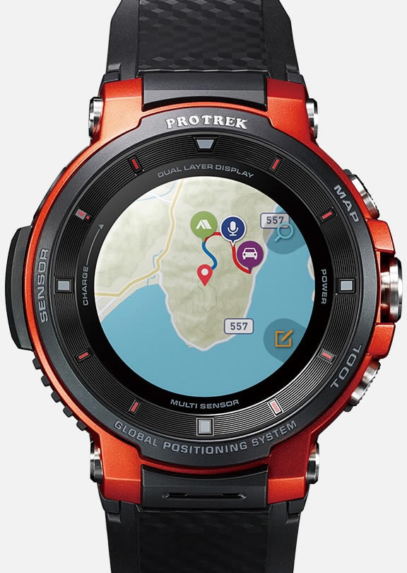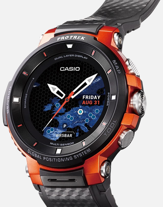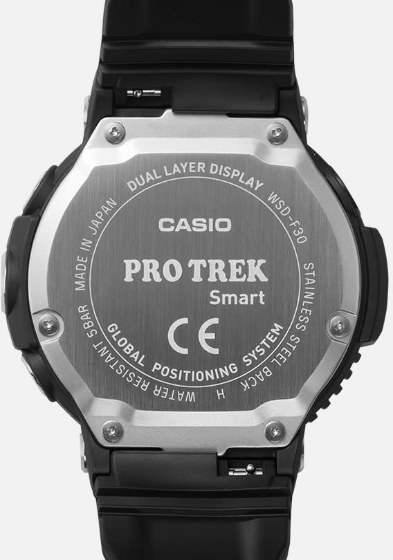Casio Pro Trek Smart WSD-F30 มากับจอแสดงผล 2 ชั้น จอแสดงผลหลัก OLED (390 x 390 พิกเซล) ขนาด 1.2 นิ้ว และชั้นบนใช้จอแสดงผล LCD ให้สีขาว-ดำ สำหรับแสดงเวลา และข้อมูลเกี่ยวกับความกดอากาศ ระดับความสูง รวมถึงเข็มทิศ