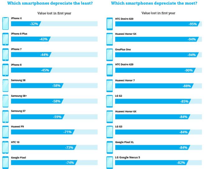 โดยรวมแล้ว iPhone X มือสอง มีมูลค่าลดลงไป 32% จากราคามือหนึ่ง ขณะที่ iPhone 8 Plus ลดลงไป 43%, iPhone 8 ลดลงไป 45%, iPhone 7 ลดลงไป 44% ขณะที่ Galaxy S8 และ S8+ มูลค่าในปัจจุบันลดลงไปถึง 58% และสามารถดูมูลค่าที่หายไปจากสมาร์ทโฟนรุ่นอื่นๆ ได้จากรูปภาพด้านล่าง