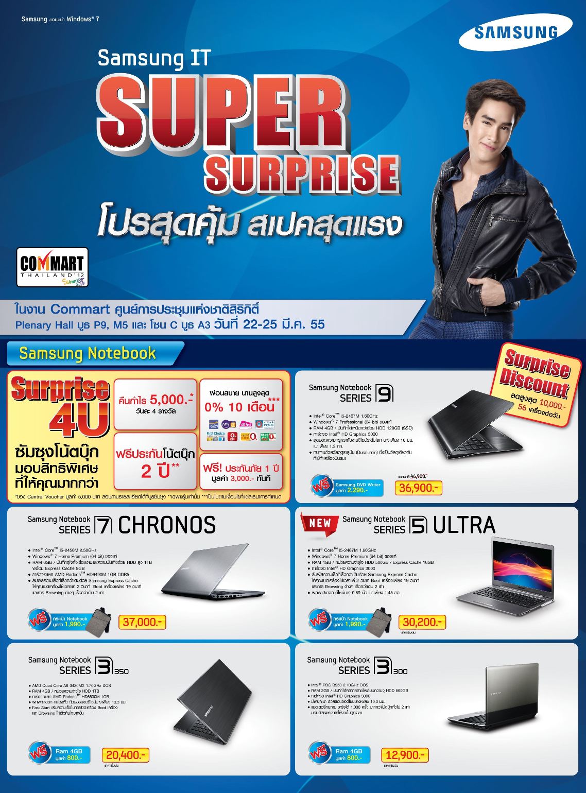 นายบุญเลิศ วิบูลย์เกียรติ ผู้อำนวยการธุรกิจไอที บริษัท ไทยซัมซุง อิเลคโทรนิคส์ จำกัด เปิดเผยว่า “ซัมซุงได้ขนทัพผลิตภัณฑ์ไอทีใหม่ล่าสุดบุกงาน “คอมมาร์ท ไทยแลนด์ 2012” อย่างยิ่งใหญ่ภายใต้สุดยอดแคมเปญ “ซูเปอร์ เซอร์ไพรส์ (Super Surprise) – โปรสุดคุ้ม สเปคสุดแรง” ซึ่งประกอบด้วย เซอร์ไพรส์ ดิสเคาน์ (Surprise Discount) ข้อเสนอราคาพิเศษที่ลดสูงสุดถึง 10,000 บาท ตามด้วย แบ็ค เซอร์ไพรส์ (Back Surprise) คืนกำไรมากถึง 5,000 บาท / รางวัล ผ่อนชำระดอกเบื้ย 0% สูงสุดนานถึง 10 เดือน พร้อมฟรีประกันภัยโน้ตบุ๊ค 1 ปี มูลค่า 3,000 บาท และ กิฟวิ่ง เซอร์ไพรส์ (Giving Surprise) ที่ซัมซุงพร้อมมอบของสมนาคุณ แบบดับเบิ้ลแก่ผู้บริโภค”