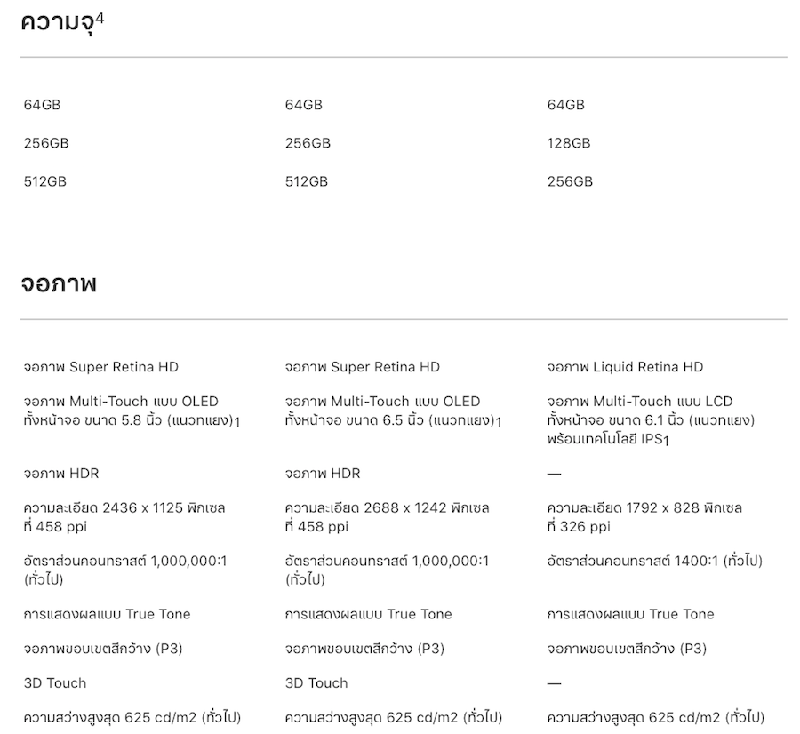 หลังจากได้เห็นการเปิดตัวอย่างเป็นทางการของ iPhone รุ่นใหม่ทั้ง 3 รุ่น ได้แก่ iPhone Xs , iPhone Xs Max และ iPhone Xr กันไปเป็นที่เรียบร้อยแล้ว หลายคนอาจมีข้อสงสัยกันว่า โดยสรุปแล้ว iPhone ทั้ง 3 รุ่นนี้ ต่างกันอย่างไรบ้าง ลองมาดูสรุปข้อมูลความแตกต่างของ iPhone ทั้ง 3 รุ่น ที่ทาง Apple ได้ทำออกมาเปรียบเทียบให้เห็นกันเลยดีกว่า ว่าจะมีอะไรที่แตกต่างกันบ้าง