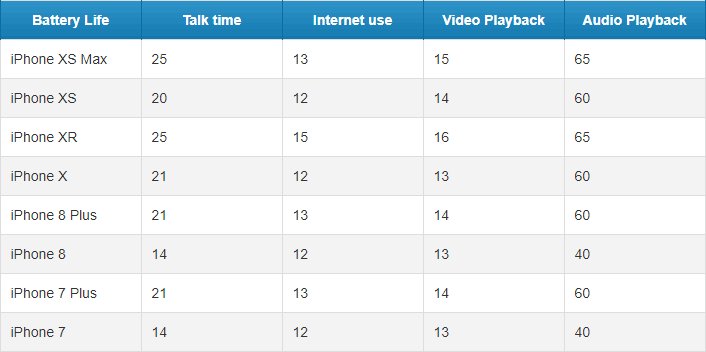 เพื่อให้เห็นภาพที่ชัดเจนมากขึ้น เว็บไซต์ Phonearena ได้ทำตารางเปรียบเทียบแบตเตอรี่ของ iPhone XS, iPhone XS Max และ iPhone XR และพบว่า iPhone ทั้ง 3 รุ่นใหม่ ให้พลังงานยาวนานกว่า iPhone รุ่นก่อนๆ และเป็น iPhone XR ที่ให้พลังงานยาวนานที่สุด แถมยังเป็น iPhone รุ่นใหม่ที่มีราคาถูกที่สุดด้วย